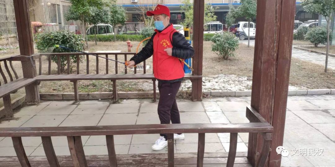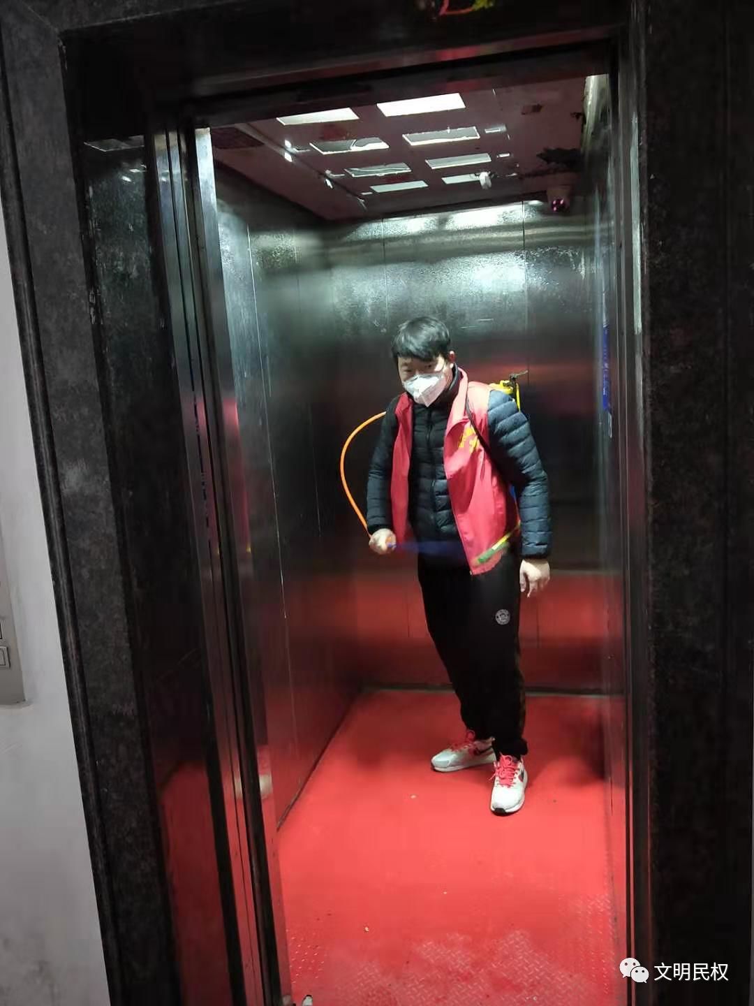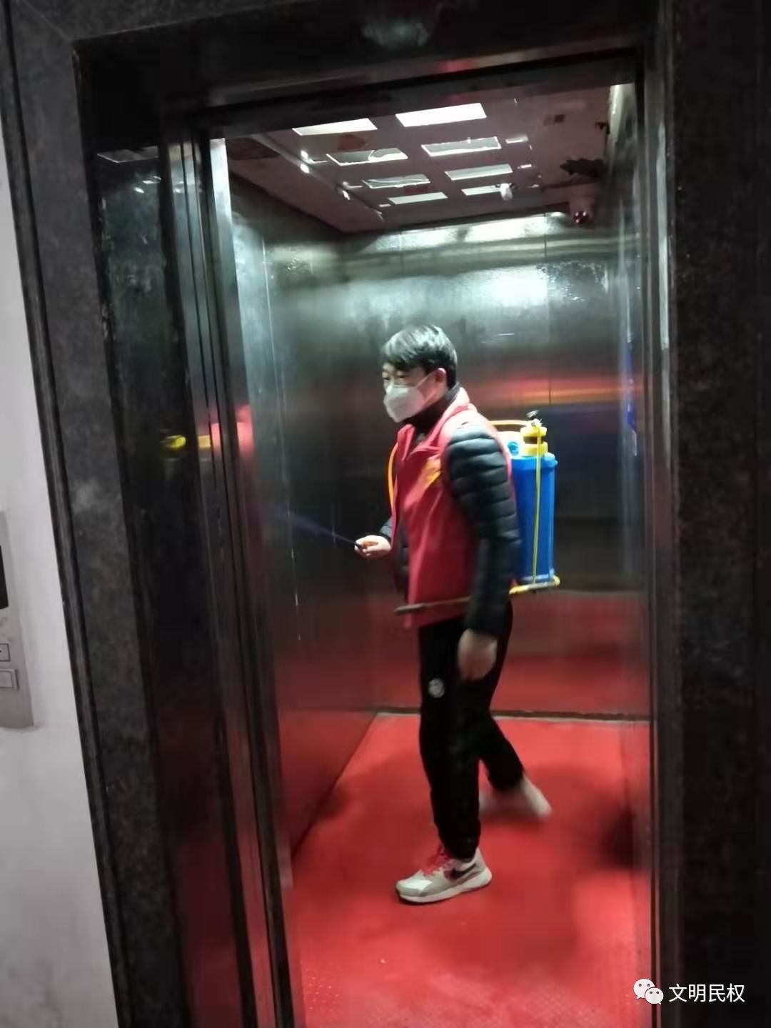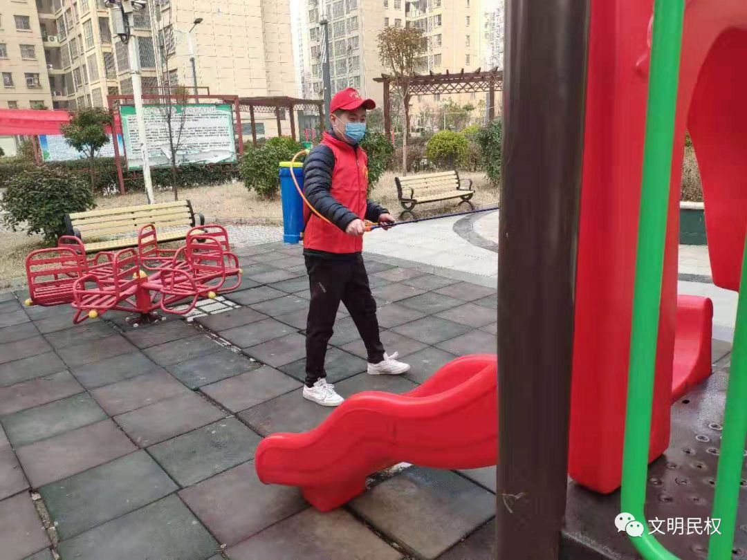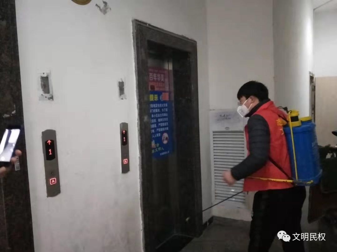 民权县仲裁院志愿者 在六合锦园三期协助物业人员为公共设施消毒