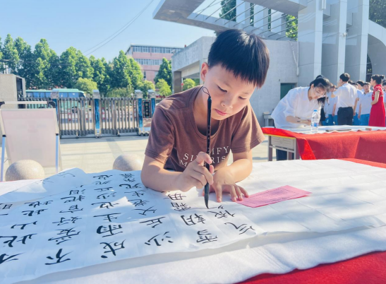 活动现场,全体师生挥毫泼墨,从一笔一划中感受文化内涵。大家时起时坐,时思时写,运笔自如,书写流畅,短短时间就完成一幅幅结构匀称、整体美观的书法作品,活动现场萦绕着浓浓的书香氛围。