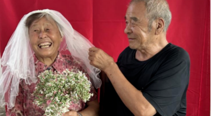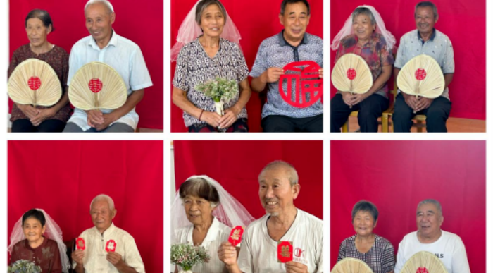 拍摄现场温馨动人。村活动室内大红背景、“囍”字蒲扇、洁白头纱和鲜花点缀其间,老人们穿着整洁,在镜头前展露笑颜。81岁的王大爷感动地说:“一辈子没正经拍过合影,今天终于圆梦了!”77岁的张奶奶细心为老伴整理衣领,李爷爷轻轻为妻子披上头纱——这些自然温暖的互动,被镜头一一记录,刻写了风雨同舟的深情。