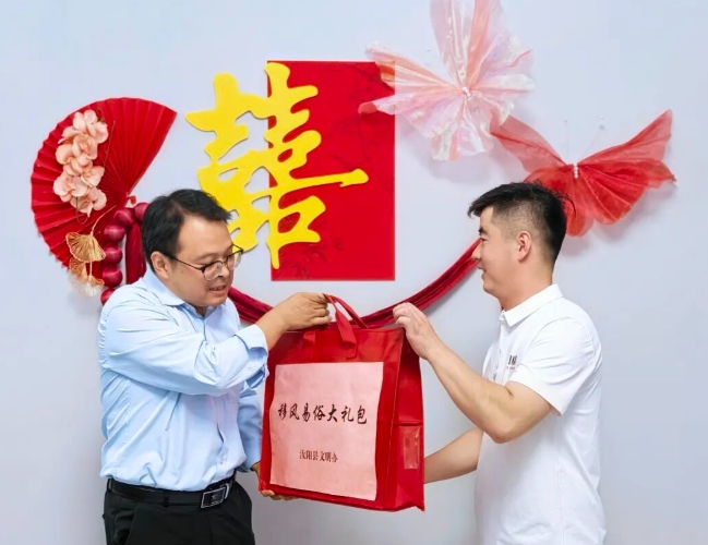 让这对新人没想到的是,他们的“简办婚礼”还获得了汝阳县文明办的点赞。该县文明办得知李博博夫妇的简办举措后,提前在其家门口摆放了移风易俗倡导牌,还送上了包含四件套、文明手册在内的“移风易俗大礼包”,让宾客在参与婚礼的同时潜移默化接受熏陶。