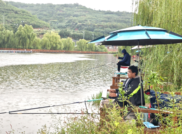 9月24日,记者来到杏花村走访。尽管雨势不小,但青山环抱的见鹤湖畔,仍聚集着不少专注的垂钓者。在见鹤湖垂钓基地,传统渔场被升级为集竞技、休闲、灯光夜市于一体的综合体验地。频繁举办的钓鱼赛事,吸引了大量爱好者前来参加。