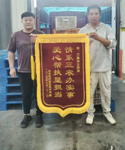 9月27日,王铁柱专程带着一面写有“情系三农办实事,爱心帮扶显担当”的锦旗,来到了万果园物流配送中心。“要是没有你们,我这一年的辛苦就全白费了。”他握着罗虎的手,反复表达着谢意。