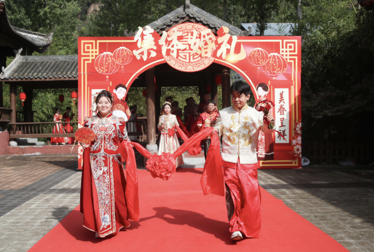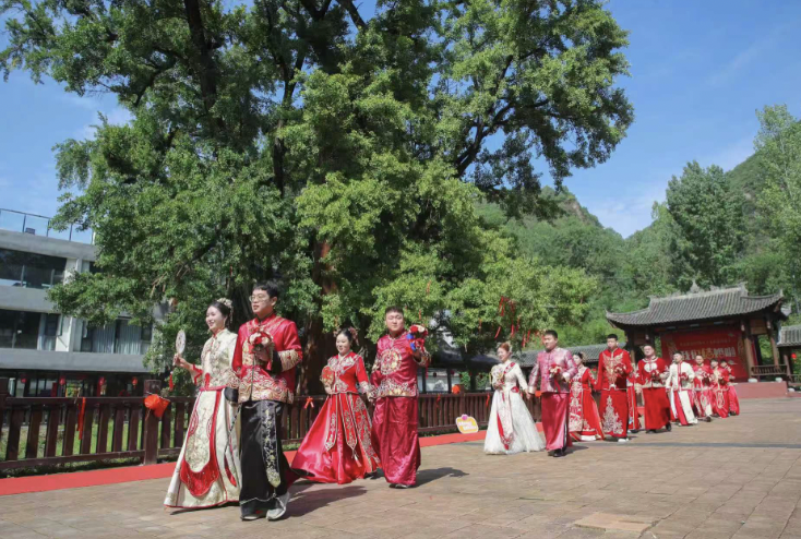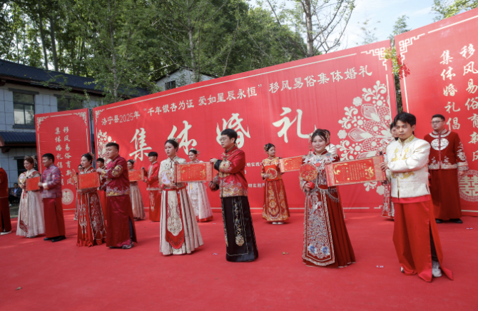 9月29日,洛阳市洛宁县2025年“千年银杏为证 爱如星辰永恒”移风易俗集体婚礼在故县镇寻峪村银杏广场举行,10对新人身着锦绣华裳在千年银杏树下喜结连理,以实际行动倡导婚事新办、简办的文明新风。