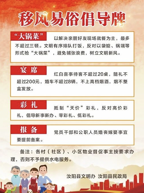 汝阳县积极推进移风易俗,倡导“喜事简办、新事新办”,一系列接地气的举措正在悄悄改变老百姓的习俗观念:婚宴不超过20桌,婚车不超过8辆,不上高档烟酒,提倡“零彩礼”或低彩礼,拒绝天价彩礼……这一举措,即使村民婚丧嫁娶保全了面子,又减轻了群众经济负担。