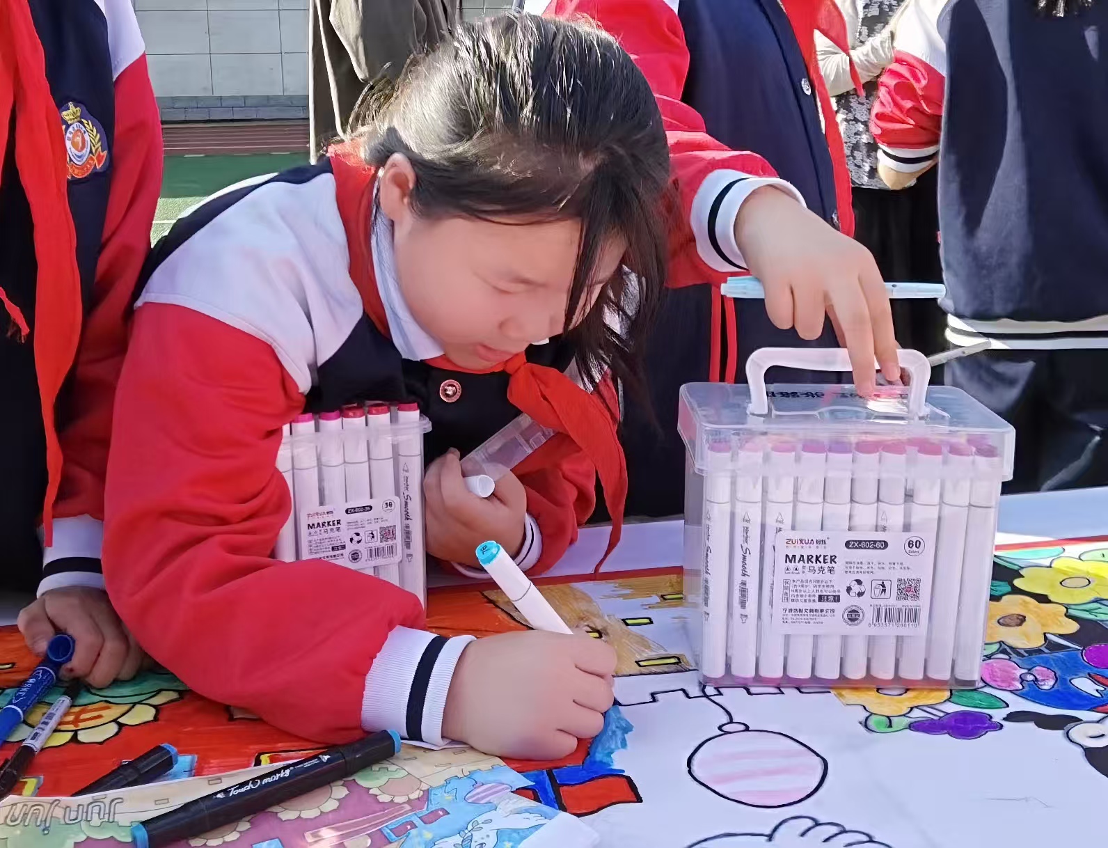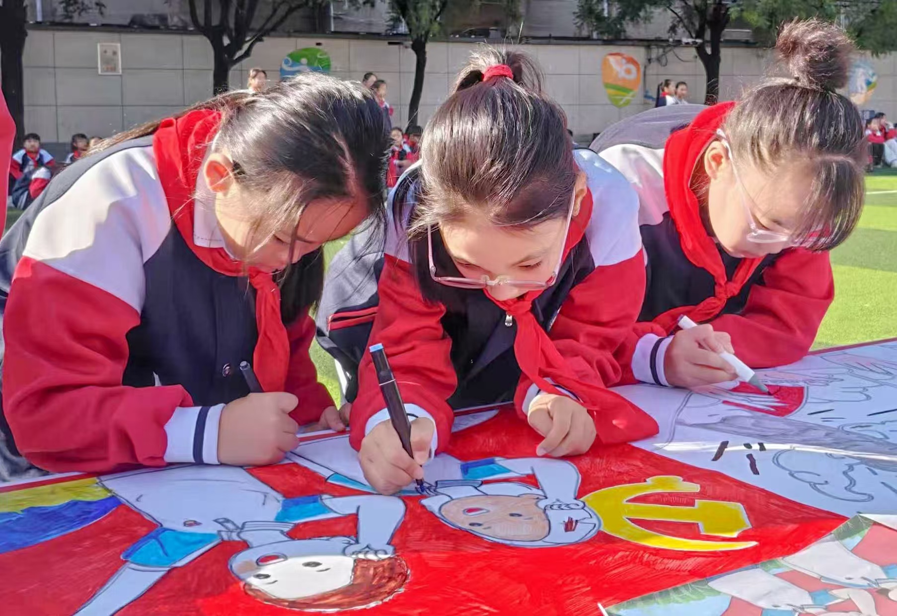除了孩子们的精彩创作,老师们也积极参与到活动中来。他们有的指导孩子们绘画技巧,有的帮助孩子们调色,有的则用相机记录下这难忘的瞬间。师生们齐心协力,共同完成了这幅意义非凡的百米长卷,孩子们看着自己的作品,脸上洋溢着自豪和喜悦的笑容。