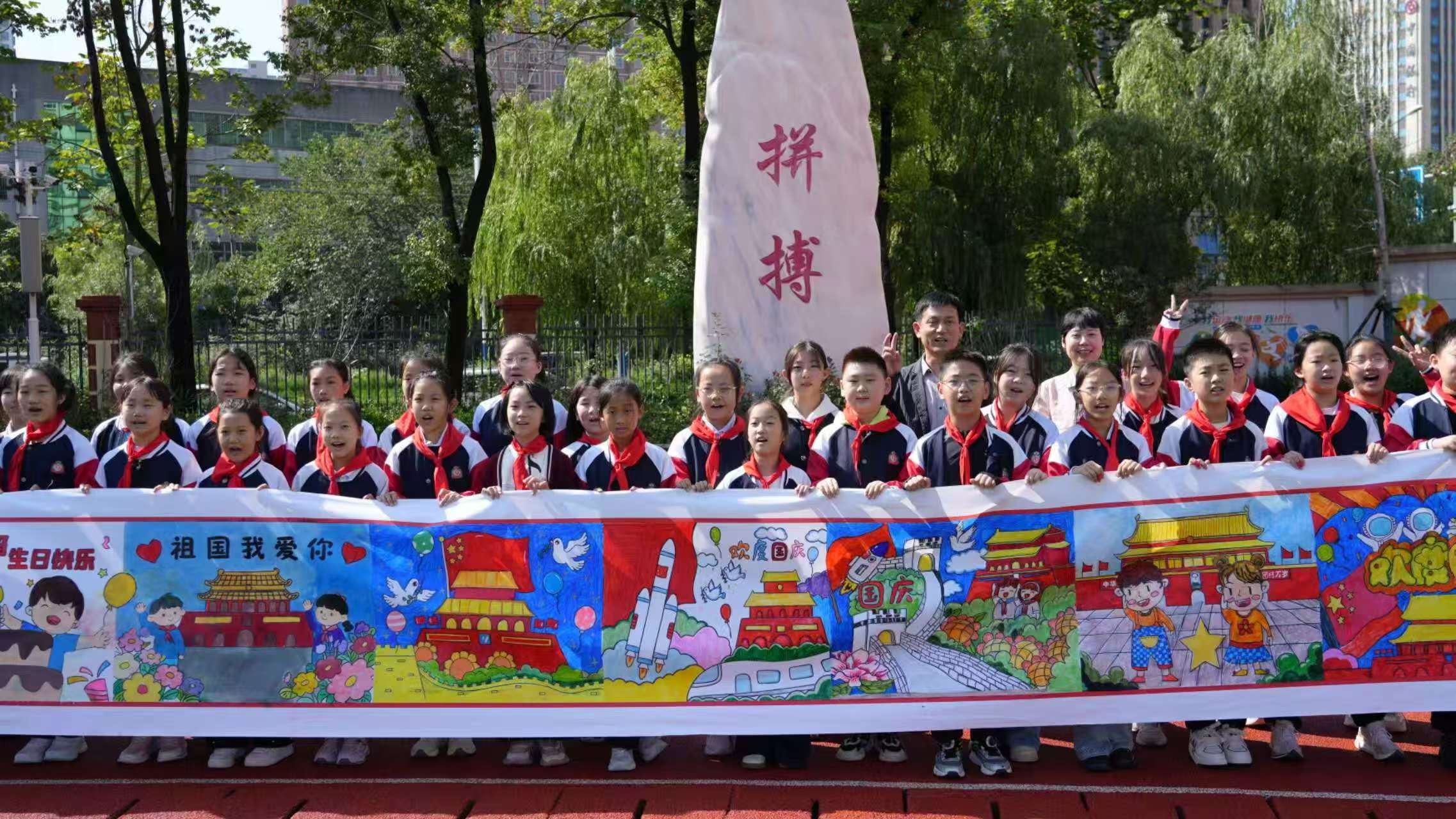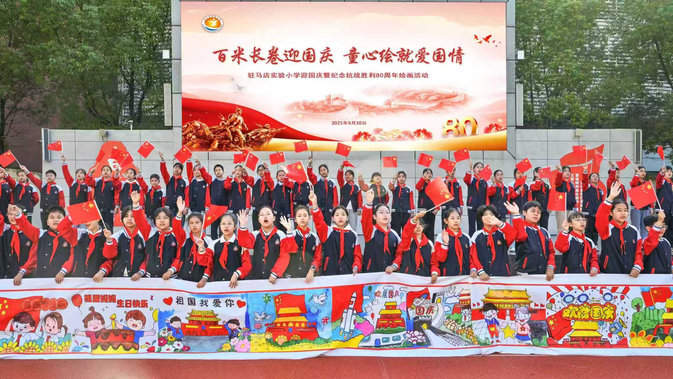 笔墨绘山河,童心颂祖国。9月30日,在国庆节即将来临之际,驻马店实验小学四个校区操场上洋溢着热烈而欢快的节日氛围,一场别开生面的“百米长卷迎国庆 童心绘就爱国情”活动在这里盛大举行,同学们共同用画笔和热情为祖国母亲送上了最真挚的祝福。