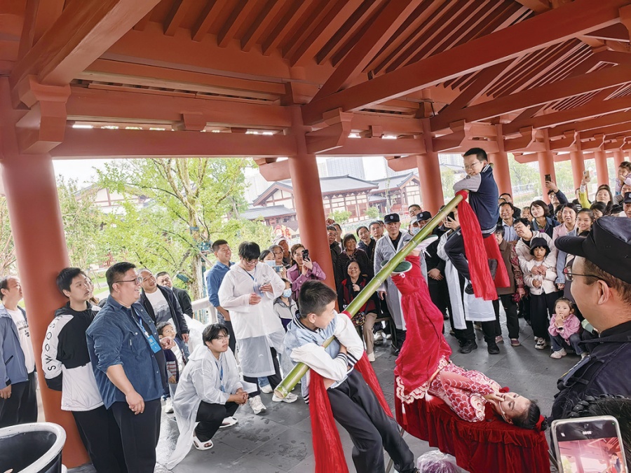 医圣文化园则多了几分沉静与敬意。张仲景雕像前,常有游客驻足鞠躬,感念这位“医圣”济世救人的仁心。园内的中医药文化长廊里,家长指着草药图谱给孩子讲解,传统文化的种子,就在这样的耳濡目染中悄然播下。穿白大褂的志愿者现场义诊,为游客量血压、讲养生,医圣的“仁术”,在节日里有了最温暖的延续。