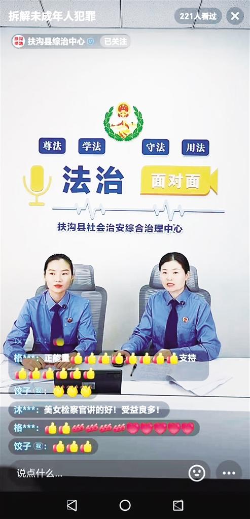 此次“法治护苗”直播课堂的开讲,是扶沟县人民检察院深化未成年人综合司法保护的重要举措。该院检察官通过案例警示与方法引导,既提升了未成年人的法律认知,也为家长开展科学家庭教育提供了参考,进一步凝聚司法、家庭、社会三方合力,共同为未成年人健康成长撑起“法治晴空”。