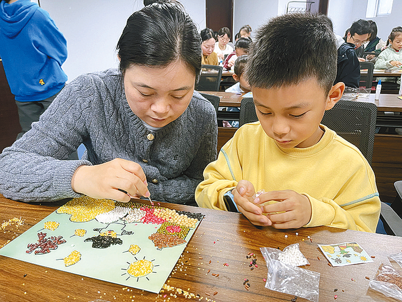 活动现场,在指导老师的带领下,孩子们变身为“粮食艺术家”,用红豆、小米、燕麦等五谷杂粮,创作出一幅幅生动的丰收图景。