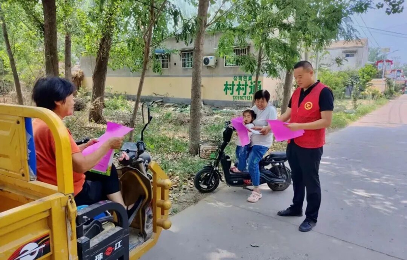 10月11日,在商丘市夏邑县栗城街道三元村,身着红马甲的干部、网格员正手持扫帚、夹子等清理路边杂物。