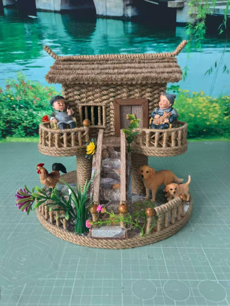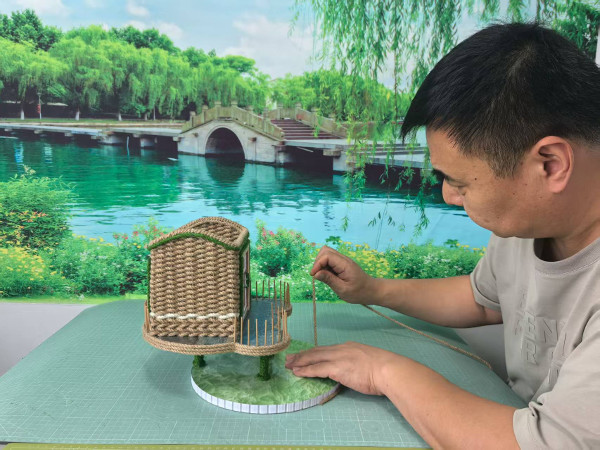 起初,黄杰选择模仿长辈编织收纳筐,却因实用性不足无人问津。“传统技艺不能只躺在过去,得跟上现在人的需求。”经过苦苦思索,他毅然决定外出考察,学习新知。最终,他将目光锁定在微缩景观这一新兴领域——用麻绳构建起乡村图景,既保留编织精髓,又契合现代审美需求。