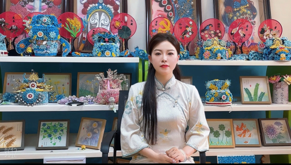 万虹臣和她的盘纸作品。