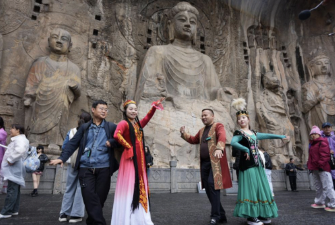 在龙门石窟前,哈萨克族快闪舞乐与千年石刻庄严对话。