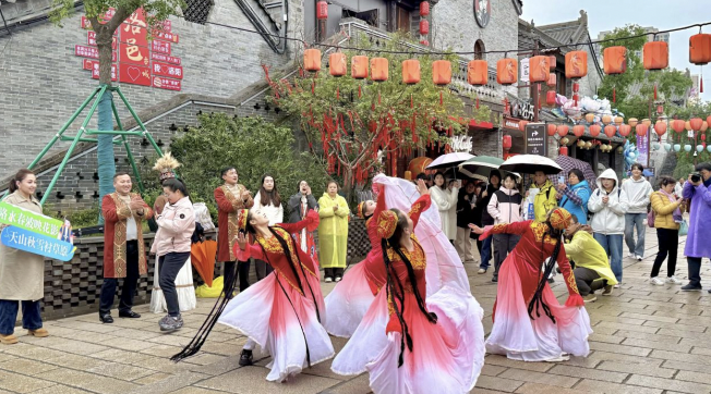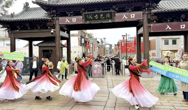 在洛邑古城内,特色歌舞与汉服文化相映成趣。