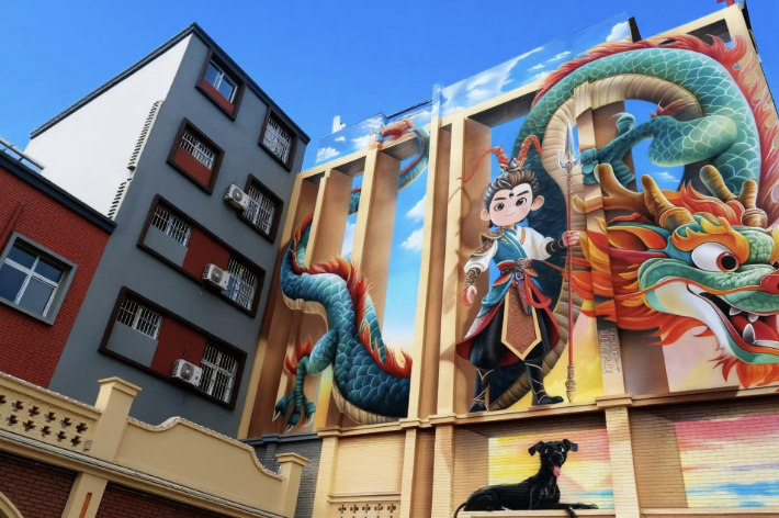 在政和路与龙门大道交叉口,一座造型生动的二郎神卡通雕塑格外引人注目,稳稳占据街区“C位”,吸引众多市民游客打卡拍照。现场工作人员正对周边的墙绘图案等进行最后的细节打磨与完善,全力为街区增添亮眼颜值。