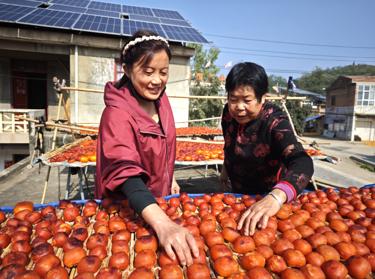 晴好日子里,村民们的屋顶、院落成了天然的晒场。在50岁的村民马红民家,屋顶的竹席上铺满了正在晾晒的柿子,它们颗颗圆润饱满,在秋日暖阳下静静酝酿着甜蜜,馥郁的香气不时引得蜜蜂流连。