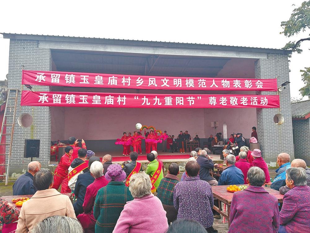 为弘扬传统孝老敬亲文化,重阳节当天,承留镇玉皇庙村开展了“九九重阳节”尊老敬老活动暨年度乡风文明模范人物表彰会,邀请全村老年人一起过节,观赏戏曲、锣鼓、舞蹈、小品表演,隆重表彰村里的好媳妇、好婆婆、好儿子,为老年人送上节日祝福。图为活动现场。 记者 任蕊蕊 通讯员 石迎峰 摄