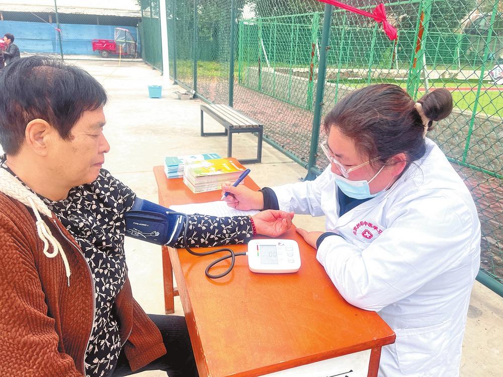 10月29日,天坛街道河西居委会联合爱心企业为老人送上慰问品,并组织义诊、表演等活动,让老人们在温馨氛围中欢度节日。图为医护人员在为老年人量血压。 记者 丁淑源 摄