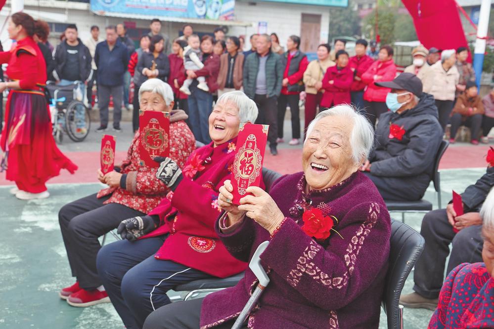 10月29日,五龙口镇裴村举办“重阳念亲恩 敬老暖人心”主题敬老活动,豫剧演员登台献艺。村里还给老人们送上了红包、粮油、鸡蛋等慰问品。图为老人们领到红包乐开了花。 记者 史丽娜 通讯员 陈晨 摄
