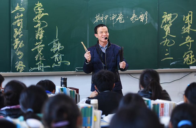 他坚持每天清晨五点半前到教室,坚持与学生一起跑操,在黑板上写下励志话语,为学生编写班歌、口号。他被学生誉为“励志教科书”,他改编的《假如生活欺骗了你》(坠子书版),激励了无数困境中的少年。