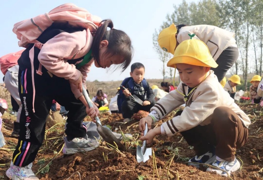 活动中,向阳幼儿园和谢庄镇中心幼儿园的孩子们互赠礼物,迅速拉近了彼此距离。随后,在田间,孩子们在老师的指导下,学会了辨认红薯藤,掌握了“顺着藤、轻刨土、慢拔薯”的诀窍。孩子们手持小铲,小心翼翼地拨开泥土,当完整的红薯破土而出时,脸上满是成就的喜悦。最后,孩子们小心翼翼地将自己的劳动成果装入袋中,还不忘互相帮忙。满身的泥土和灿烂的笑容,是他们这堂秋日课程最好的奖章。