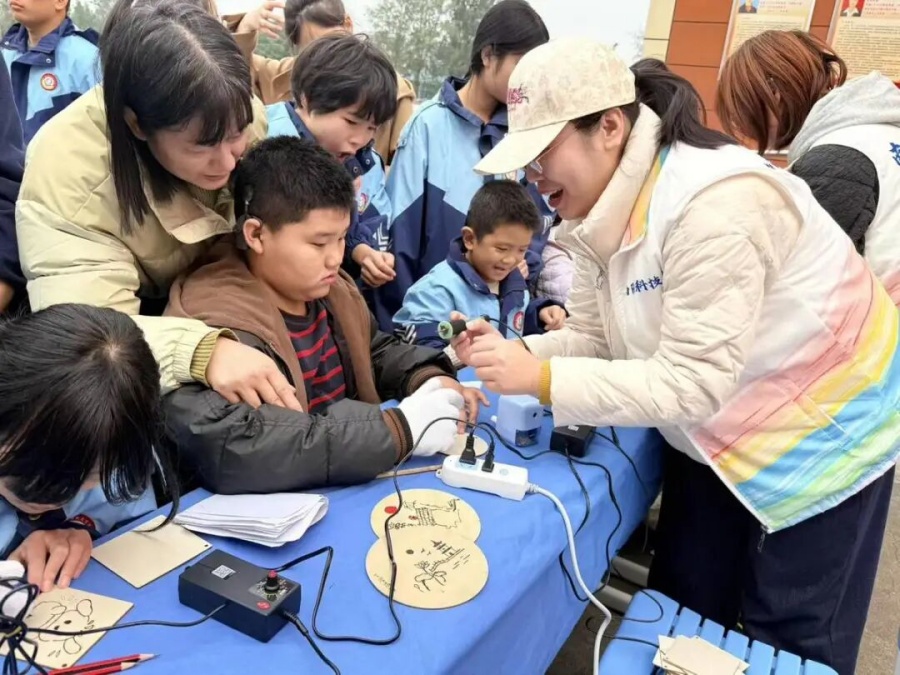 在活动现场,南阳市科技馆的“科普大篷车”化身为一间灵动的“移动科技馆”,视觉暂留、磁力转动、尖端放电等,这些平日里在课本上才出现的科学原理,通过可触摸、可操作、可观察的形式,沉浸式呈现在孩子们面前。在互动体验现场,剪纸区的同学专注地折叠彩纸,巧手剪出对称的图案;烙画台前,电烙笔在木板上游走,空气中飘散着淡淡的木香;拓印区的同学们轻轻敲打按压,让古老的纹路在纸上重现;智能机器人的每个动作都引来阵阵欢呼与惊叹……这一刻,科技不再是课本上枯燥的名词,而是可以触摸、可以感受的奇妙体验。