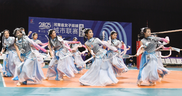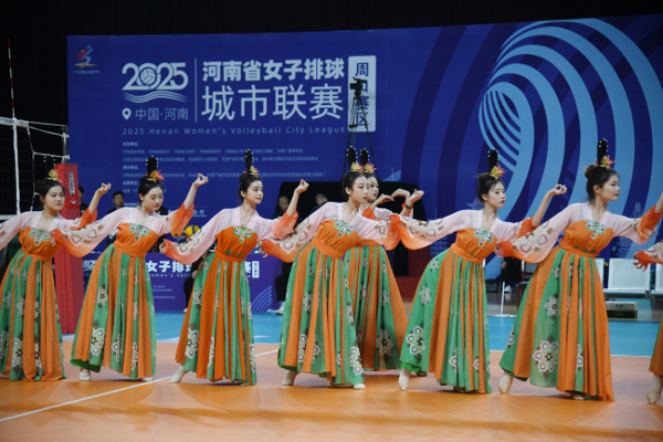 11月1日,周口女排主场迎战洛阳队的比赛开始前,赛场率先开启文体表演环节。3个特色舞蹈节目瞬间赢得满堂喝彩。舞蹈《宛丘·入莲间》以《诗经》中对淮阳(古宛丘)的诗意记载为蓝本,少女们以灵动轻盈的舞姿模拟穿梭荷叶间的场景,生动再现了先秦时期宛丘水丰荷盛的秀美景致;《唐印》以唐代彩绘陶俑为灵感来源,通过“塌腰撅臀”的体态、“圆手翘指”的手势等细腻动作,将静态文物转化为富有生命力的动态艺术,巧妙暗含传统文化在当代的新生与传承;《天浴》则以高原为背景,借圣洁优美的舞蹈语言,传递对自然的感恩和对生命的礼赞。