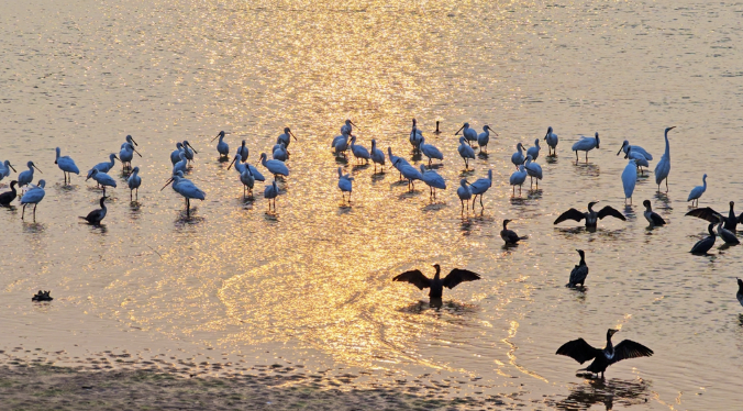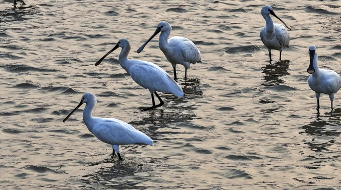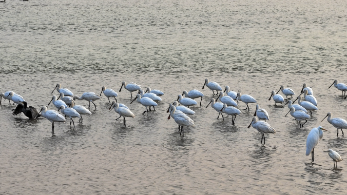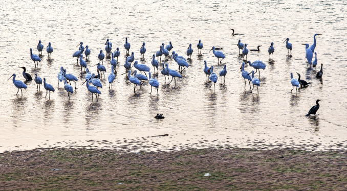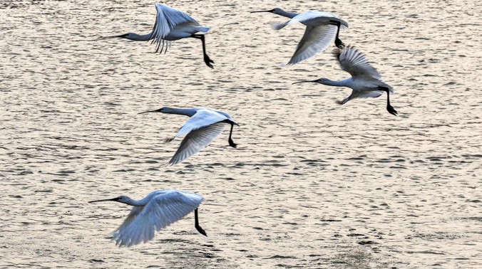 11月4日,洛阳市孟津区国家级黄河湿地保护区,迎来大约60只“熟客”国家二级保护动物白琵鹭,白琵鹭因其嘴长而直,且前端扩大呈匙状,扁阔似琵琶而得名,是鹭中嘴巴最长的一种;因其全身白羽、颈长挺拨、轻盈灵巧、体貌动人,故有“飞鸟美人”之称。