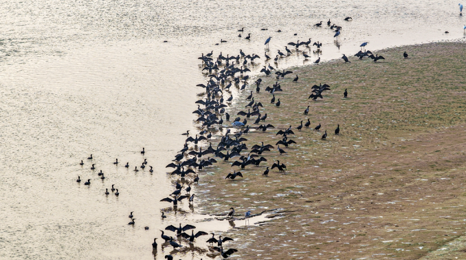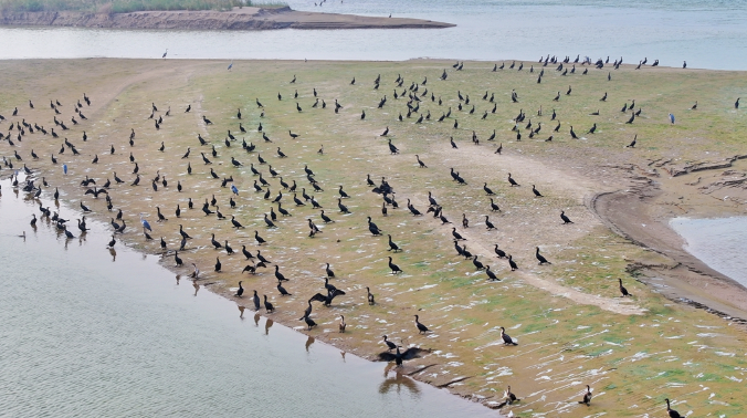 在黄河会盟段的一处夹心滩上聚集白琵鹭、鸬鹚、白鹭、豆雁等迁徙鸟类,尤其是鸬鹚种群庞大,成群连片,铺展出一幅万鸟翔集的生态画卷。