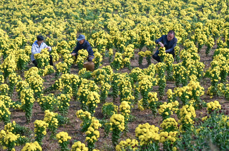 11月4日,在洛阳市嵩县大坪乡宋岭村菊花种植基地,村民们忙着采收菊花。