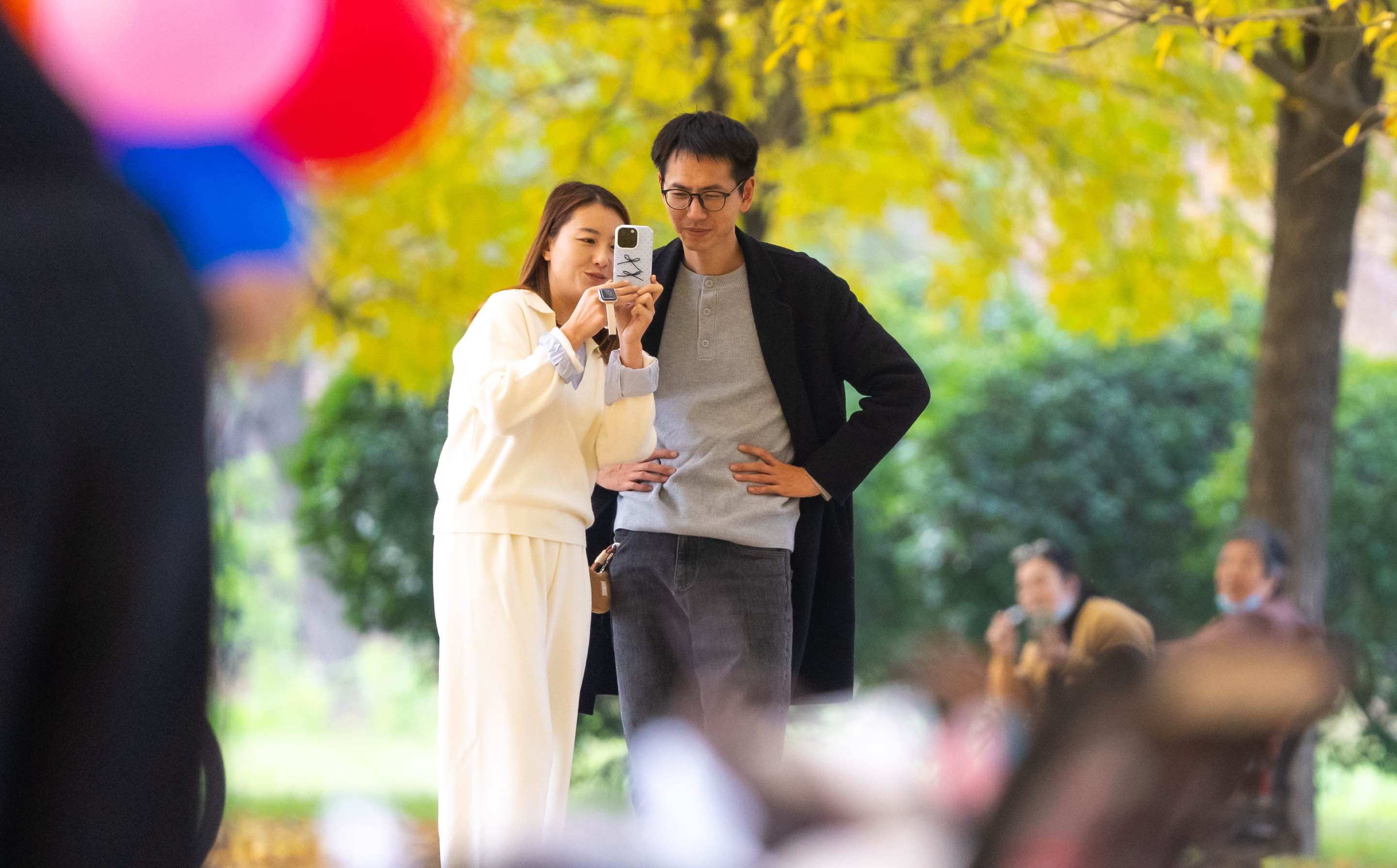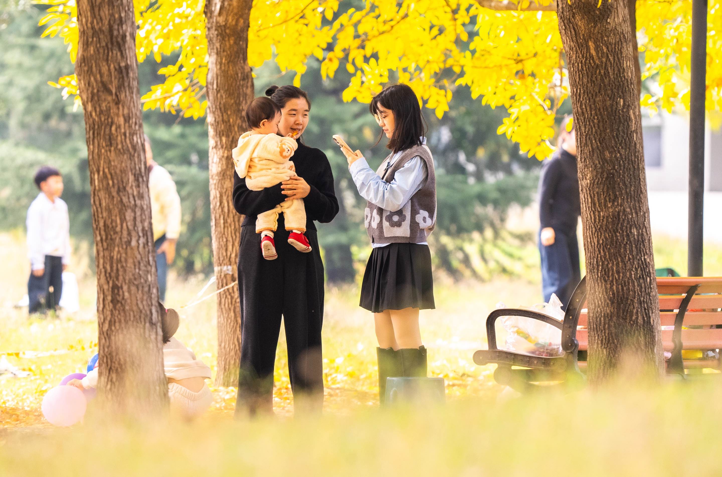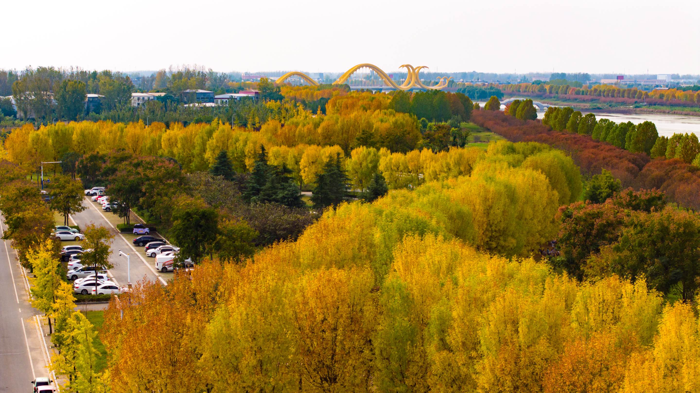 近日,驻马店西平县嫘祖河畔,层林尽染,市民在金黄的秋色中露营休闲,享受周末时光。