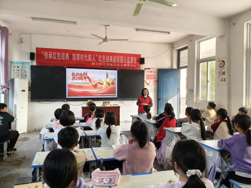 11月5日下午,周口市三川社工义工服务中心组织志愿者走进周口市第十七初级中学,为学生们带来了一堂以“铭记历史,吾辈自强”为主题的爱国主义教育课,旨在通过重温抗战历史、讲述英雄故事,激发青少年传承红色基因、厚植家国情怀。