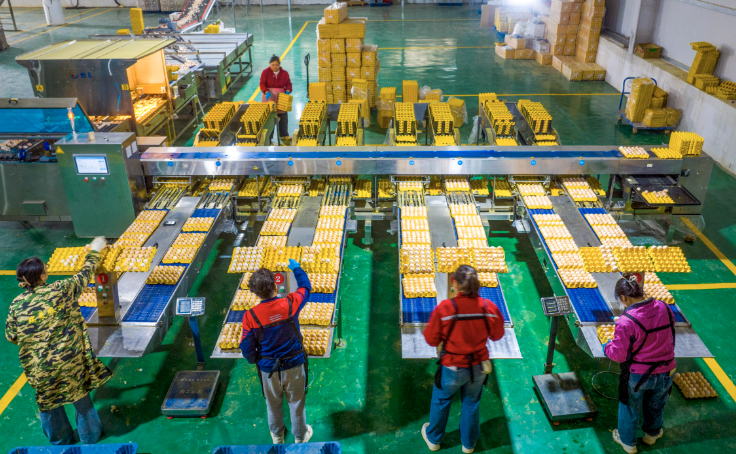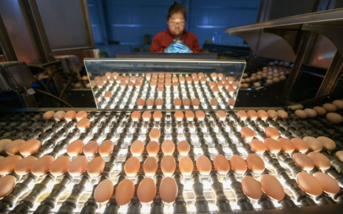 11月10日,在洛阳市新安县铁门镇的宇鸾蛋鸡养殖一期项目厂房内,工作人员有的在分拣鸡蛋,有的在查看蛋鸡生长情况。