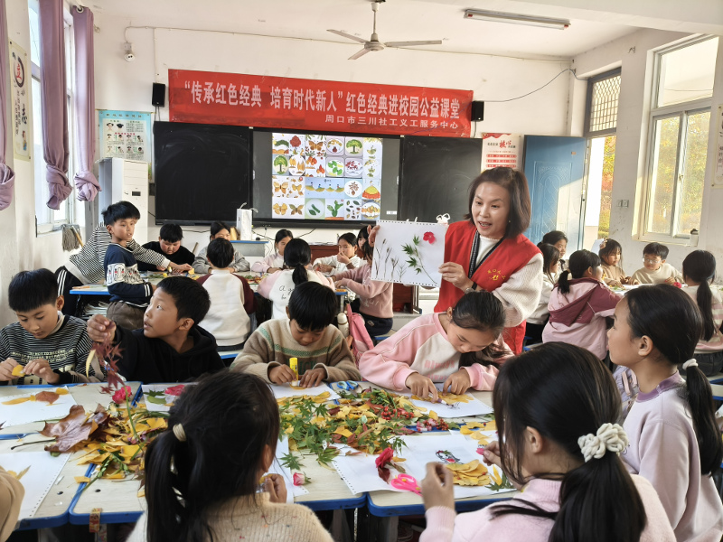 11月11日,周口市第十七初级中学小学部四(1)班教室里欢声笑语不断,一场由周口市三川社工义工服务中心社工田洁精心策划的“树叶变变变”创意手工画活动正在这里举行。活动中,孩子们化身“小小艺术家”:有的专注修剪叶片边缘,将落叶雕琢成“仙人掌”;有的用落叶拼贴出飘逸的“裙摆”,创作出“穿着花裙子的小女孩”;有的巧妙组合多种树叶,让“蝴蝶”与“昆虫”在纸间翩跹起舞。