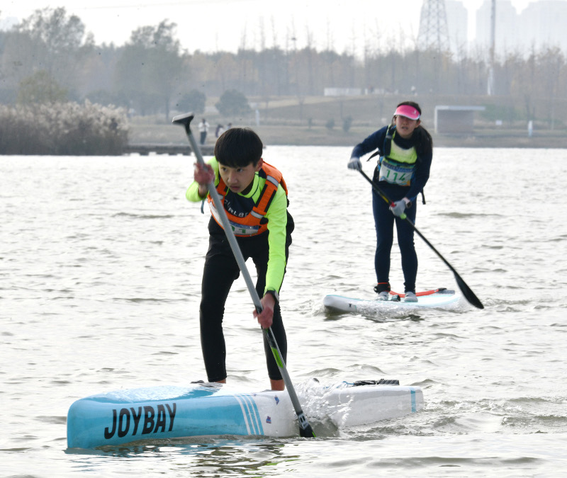 桨板运动作为一项年轻时尚的户外项目,近年来在国内迅速普及。周口市桨板运动协会自2024年年初成立以来,已发展会员数百人,整体运动水平持续提升,并于去年夏季成功承办河南省首届“桨板环湖”赛,赢得广泛关注。本届赛事由周口市城乡一体化示范区管理委员会、周口日报社、市慈善总会、市体育事业发展中心联合主办。虽值初冬,湖水微寒,却难挡桨板爱好者如火的参赛热情,参赛规模较上届进一步扩大。