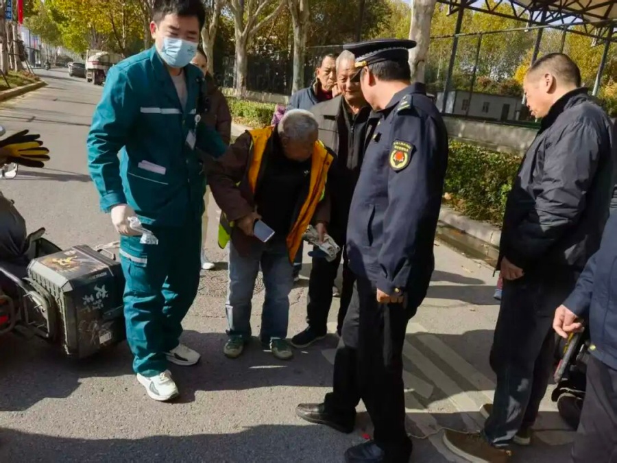 11月20日,市城区如意湖大道非机动车道上,一名外卖员不慎撞倒环卫工人。正在巡查的市容保障科如意湖示范中队队员张士庆、张远迁、方航立即上前。他们分工明确,一边拨打120清晰说明情况,一边报警保护现场,同时不断安抚伤者情绪。救护车抵达后,他们又协助医护人员小心翼翼地将伤者转移上车,其专业处置与温情守护赢得了现场市民的赞许。