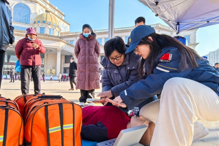 图为12月4日,市蓝天救援队志愿者在濮阳文化艺术中心广场开展应急救护科普活动。