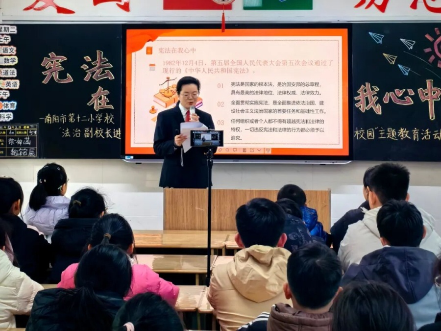 12月2日,南阳市中级人民法院走进南阳市第十二小学校开展以“宪法在我心中 做文明好少年”为主题的宪法宣讲活动,为同学们带来了一堂生动而深刻的法治启蒙课。