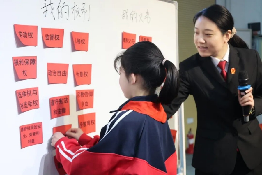 活动现场,法官用通俗易懂的语言,结合生动案例,向同学们讲解了宪法的地位、作用以及与日常生活息息相关的条款。讲解过程中,法官不时抛出问题,同学们聚精会神,争相回答,在互动问答中加深了对宪法知识的理解。法院干警精心设计了“我的权利和义务”分类小游戏,让同学们识别出正确的内容,分别将卡片粘贴到规定的区域内,在欢声笑语中巩固了刚刚学到的宪法知识。本次活动特别设置了法袍试穿环节,学生代表试穿法袍,亲身感受司法庄严,工作人员向学生们详细讲解法袍的象征意义。活动尾声,法院干警向同学们赠送了“宪法知识小书签”,大家爱不释手,纷纷表示要把它用在课本里,让法律知识常伴阅读时光。