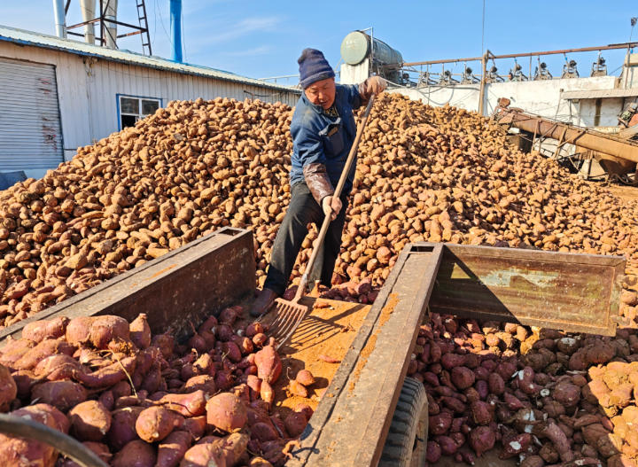 近日,洛报融媒记者来到宜阳县韩城镇走访。在洛阳金薯王农业科技有限公司,工人们挥动耙子,利落地将带着泥土芬芳的红薯从车上卸下。一旁的自动化生产线正将新鲜红薯转化为洁白的淀粉。