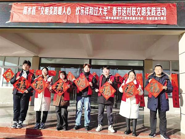 蛇年春节前夕,东城街道苏坡村文化广场上翰墨飘香。“文明实践暖人心 欢乐祥和过大年”送春联活动在这里火热进行。中国书法家协会会员苏殿春和书法爱好者挥毫泼墨,既书写吉祥的通用春联,也根据村民的意愿,为他们量身定制。“这手写的春联比买的更有年味儿,更有人情味儿。”退伍军人苏国林拿着墨迹未干的春联,乐得合不拢嘴。大学生志愿者则带着春联和移风易俗宣传册走村入户,将新春祝福与文明理念一同送达。