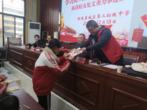 “全国见义勇为英雄”陈锋向西峡县城区二中学答题正确学生颁发雷锋事迹书籍