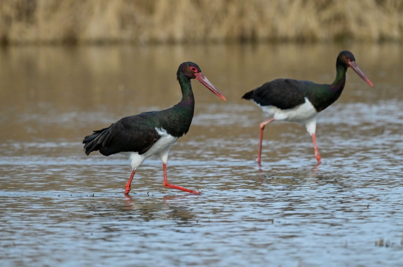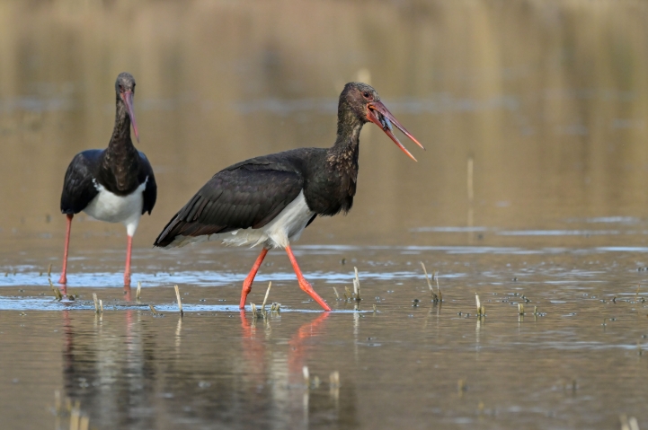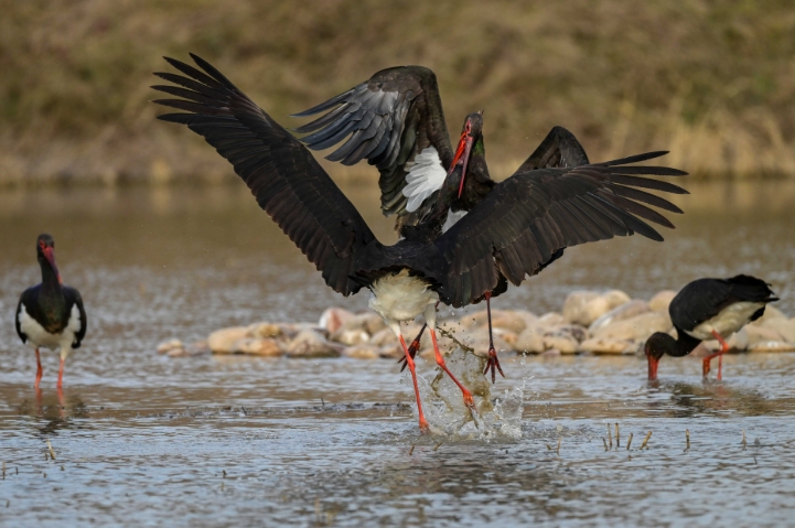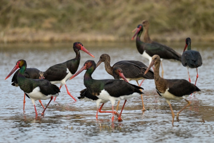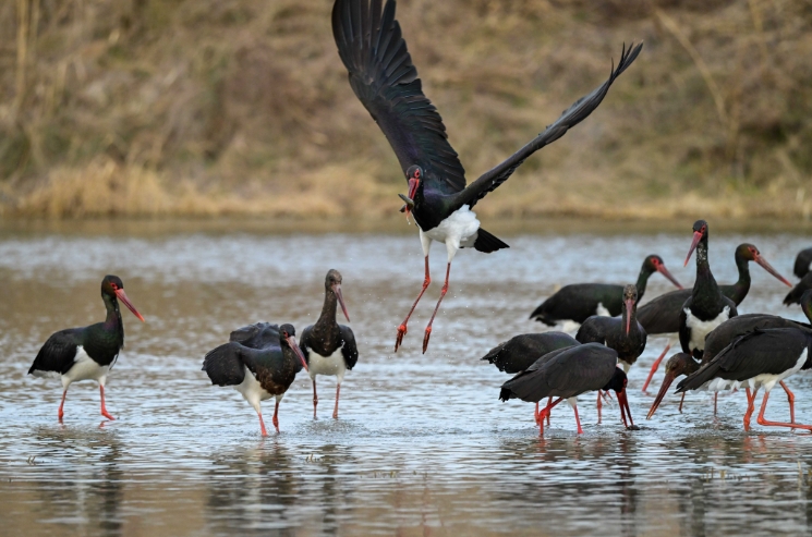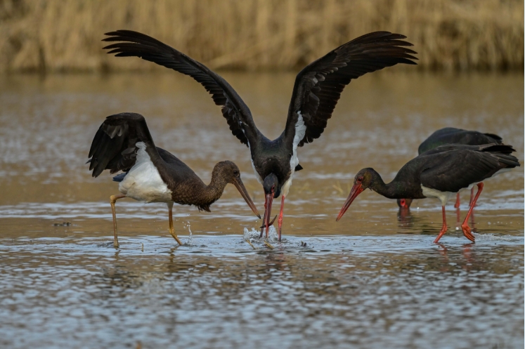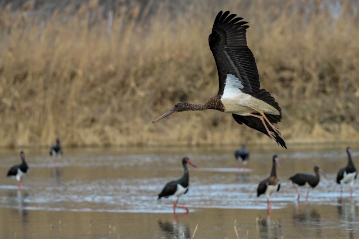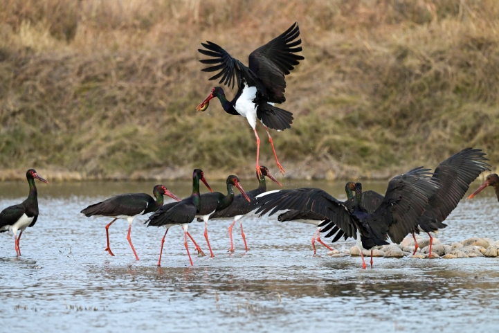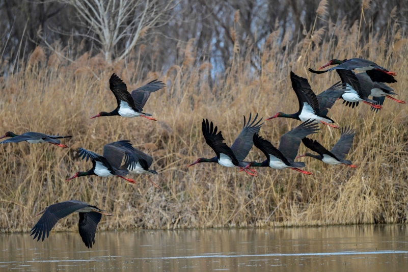12月20日,黑鹳在洛阳市孟津区黄河湿地觅食、嬉戏。