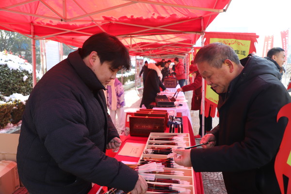 这里不仅是舞台,更是热闹的“文化大集”。台上,百余支文艺队伍你方唱罢我登场:戏曲声韵悠长,大鼓书荡气回肠,民俗舞蹈活力四射。接地气的表演,引发现场阵阵喝彩与掌声,浓浓的年味在空气中弥漫。 台下,则是一个可逛、可赏、可品、可玩的沉浸式非遗天地。40余家非遗与文创摊位依次排开,俨然一条流动的文化长廊。省级非遗汝阳刘毛笔的传承人现场执刀修笔,展现“千万毛中择一毫”的精湛;周口市级非遗葫芦烙画旁,观众凝神观看,红亮的烙铁如何在葫芦上“画”出吉祥图案。老技艺在现场焕发新光彩。