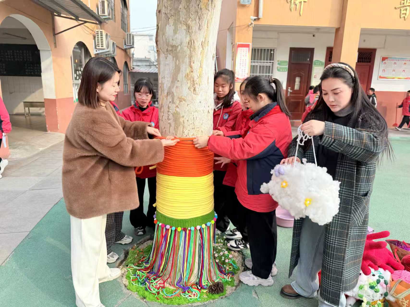 活动现场气氛温馨、创意飞扬。在美术老师的细心指导下,孩子们认真学习编织、拼接、装饰的技法,用心打磨每一处细节;班主任老师们则全程陪伴,维持秩序,守护安全。师生化身“自然艺术家”,将五彩毛线轻柔缠绕于树干之间,悬挂上可爱的卡通饰品、喜庆的红灯笼......原本朴素的树木,转眼变成了充满童趣与艺术感的“生态创意树”。