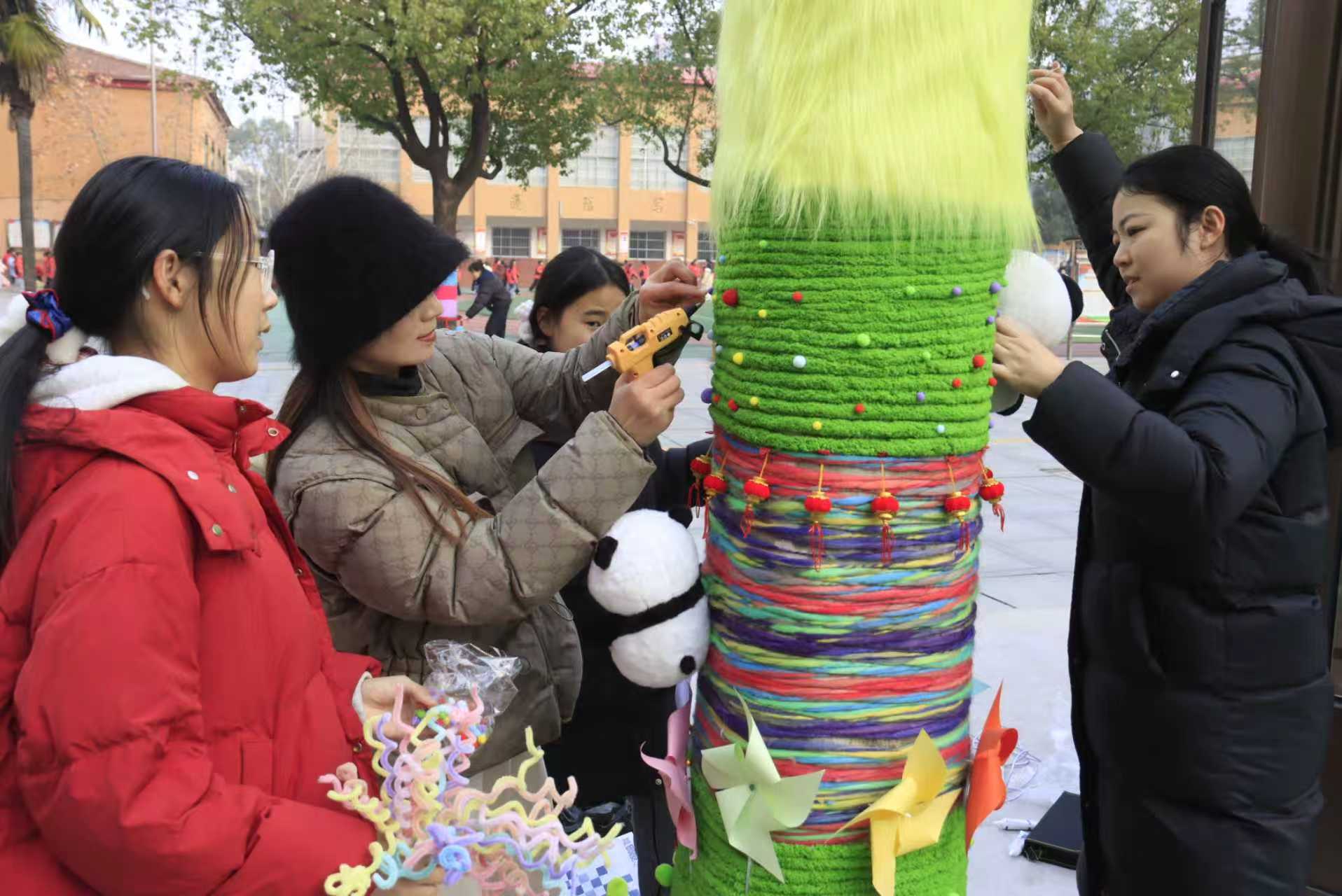 师生们分工合作、默契配合,有的登上梯架细心系挂,有的俯身树下精心点缀。欢声笑语在校园里回荡,浓浓的年味与童真在空气中悄然流淌。