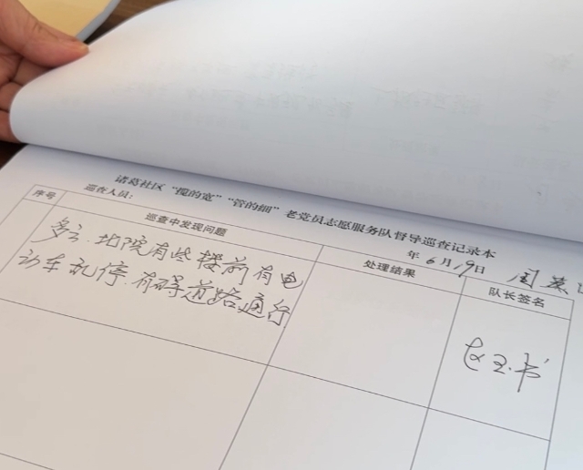 老人们的价值,远不止于“发现”与“记录”。诸葛社区相关负责人说,那一本本工作日志,实质上是社区治理的“民情晴雨表”和“问题督办单”。对队员们巡逻结束后分类汇总的各类问题,社区建立了高效的“受理—反馈—办结”闭环机制。日志上“路面损坏”的记录,迅速转化为施工队的修复作业;“树叶堆积”的建议,立刻促成保洁人员的及时清扫。