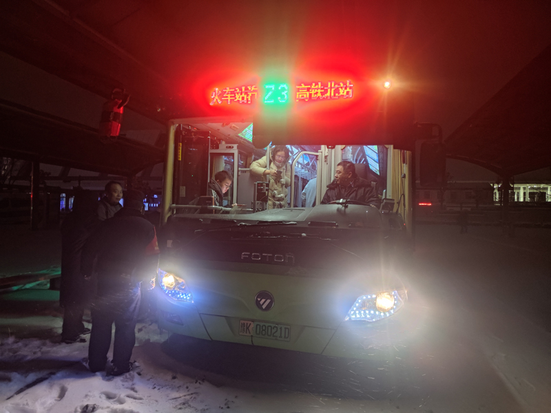 雪势未减,行车风险陡增。Z3路线路长赵爱军主动请缨:“我路况熟,我来!”他驱车火速从家中赶往高铁站。与此同时,车长崔松伟已提前将公交车停靠在高铁站出站口,打开暖风等候。