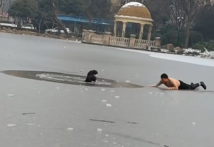 班隽楠来不及多想,脱下外套塞到女儿手中,转身便冲向湖边。他深知冰面脆弱,不敢贸然直立前行,当即趴在冰面上匍匐靠近。可就在距离落水儿童仅有几步之遥时冰面破裂,班隽楠也不慎坠入水中。