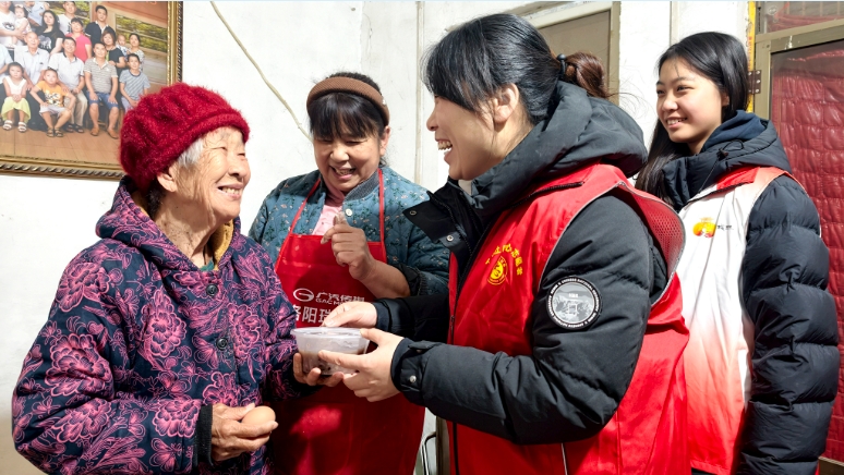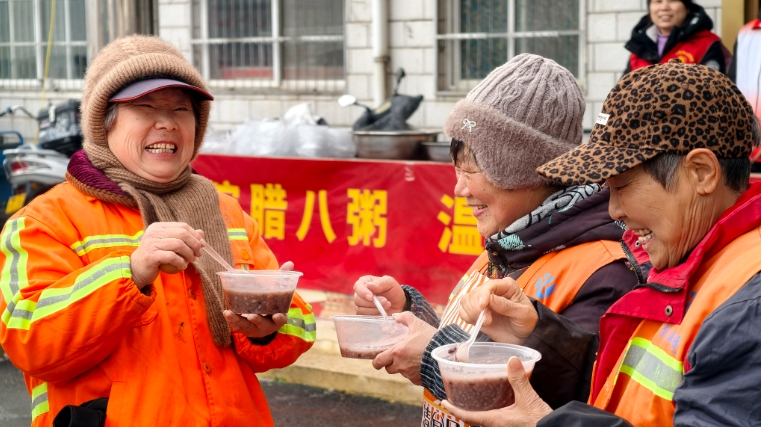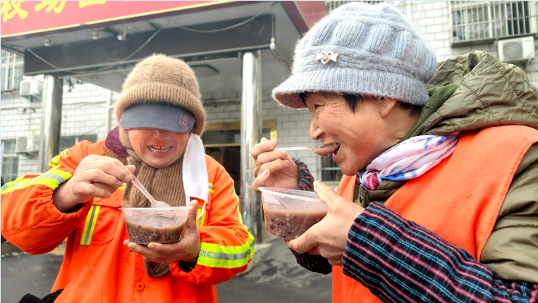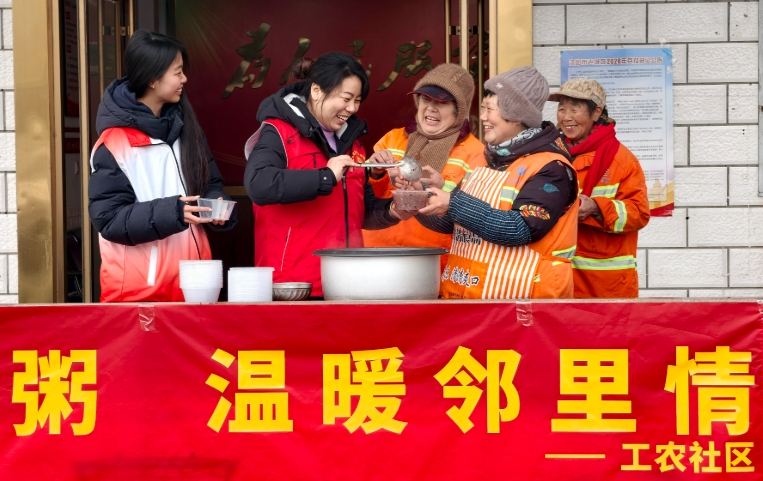 1月26日是农历腊月初八,中国传统的“腊八节”,洛阳市老城区南关街道工农社区的志愿者熬制腊八粥,邀请辖区居民、环卫工人等品尝,传递温情与祝福。